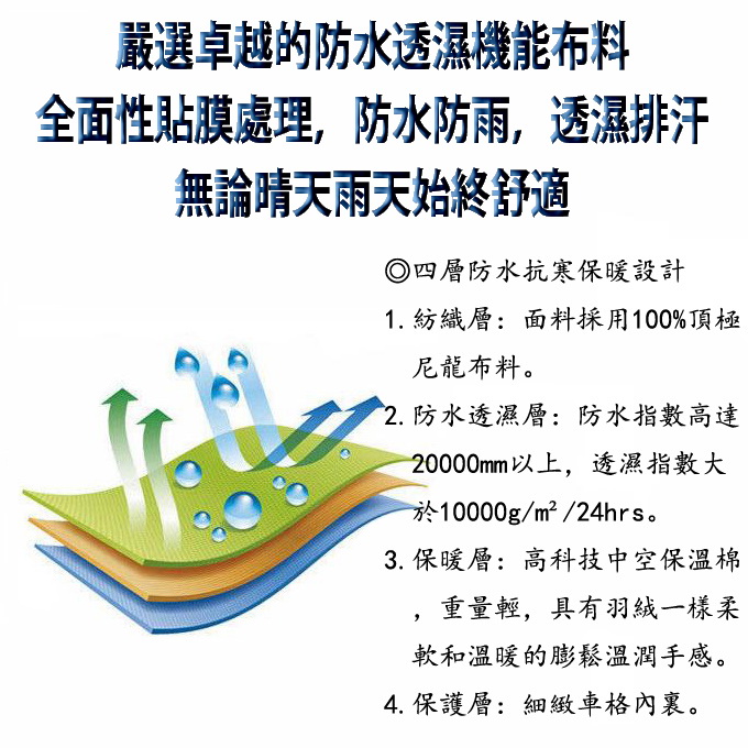 防風、防水、透濕、透氣、保暖、高顯視 |